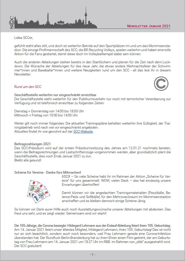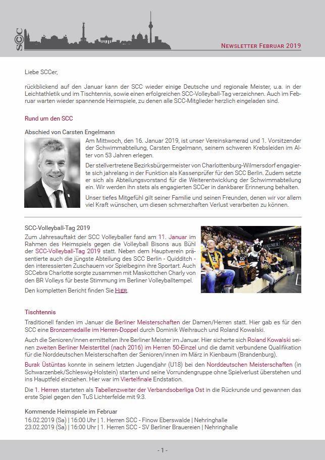 Hoffentlich sind Sie gut ins das Neue Jahr gekommen. Das SCC-Präsidium und die Geschäftsstelle wünschen Ihnen auf diesem Weg ein gesundes, glückliches und erfolgreiches Jahr 2020. Dabei liegt das letzte Jahreshighlight des Jahres 2019 noch nicht lange zurück. Der SCC-Volleyballtag unserer BR Volleys beim Ligaspiel gegen die United Volleys Frankfurt am 4. Advent war ein schöner und erfolgreicher Jahresausklang für den gesamten SCC. Das Spiel wurde - auch durch die Unterstützung von 450 SCCern in den tollen Fanshirts - gewonnen. Die Hallensaison ist nun für die meisten SCC-Sportler in vollem Gange. Darüber informieren wir Sie in diesem Newsletter.