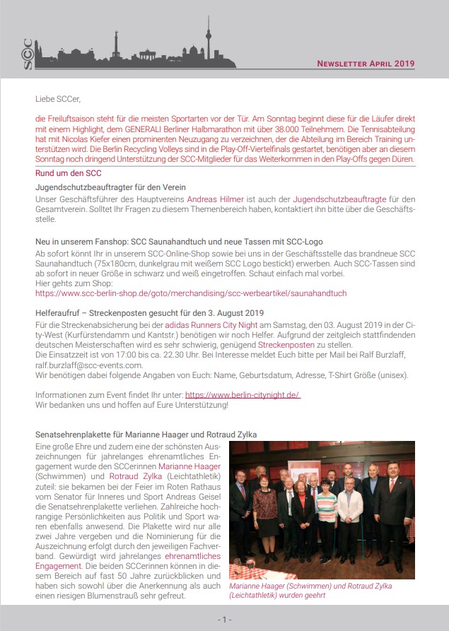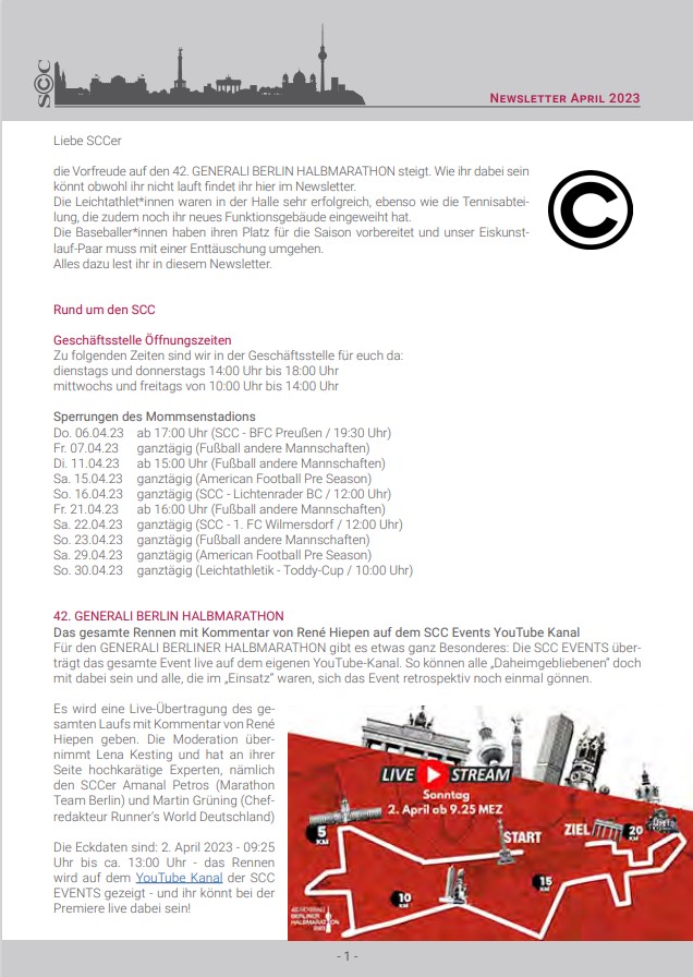 die Freiluftsaison steht für die meisten Sportarten vor der Tür. Am Sonntag beginnt diese für die Läufer direkt mit einem Highlight, dem GENERALI Berliner Halbmarathon mit über 38.000 Teilnehmern. Die Tennisabteilung hat mit Nicolas Kiefer einen prominenten Neuzugang zu verzeichnen, der die Abteilung im Bereich Training unterstützen wird. Die Berlin Recycling Volleys sind in die Play-Off-Viertelfinals gestartet, benötigen aber an diesem Sonntag noch dringend Unterstützung der SCC-Mitglieder für das Weiterkommen in den Play-Offs gegen Düren.