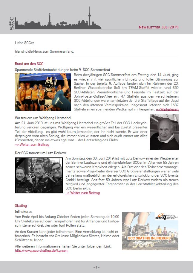 Halbzeit - das Jahr 2016 geht in die zweite Jahreshälfte. Und diese beginnt genauso, wie die vorherige geendet hat: mit vielen sportlichen Ereignissen! Neben neuen Kursen der Gesundheitssportabteilung und den aktuell anstehenden Wettkampfterminen, blicken wir außerdem noch einmal auf die zahlreichen Ereignisse des vergangenen Monats zurück. So z. B. das SCC-Sommerfest, den Nachwuchssportler des Monats Juni, die Berlin Open (Lacrosse) und das 23. Midsommar-Sportfest.