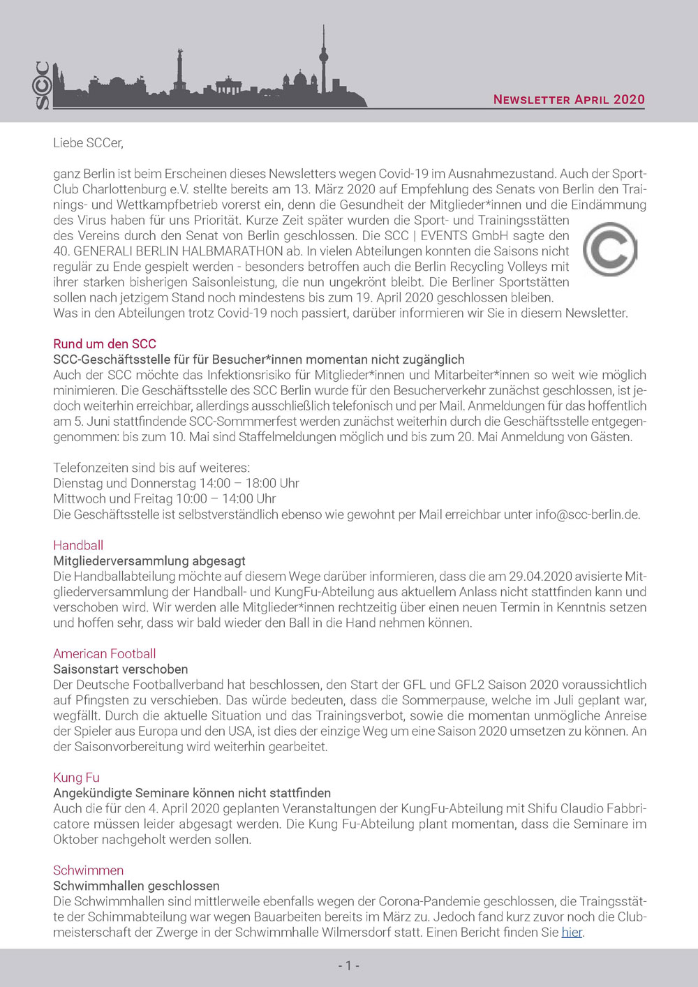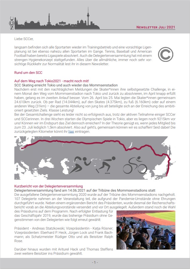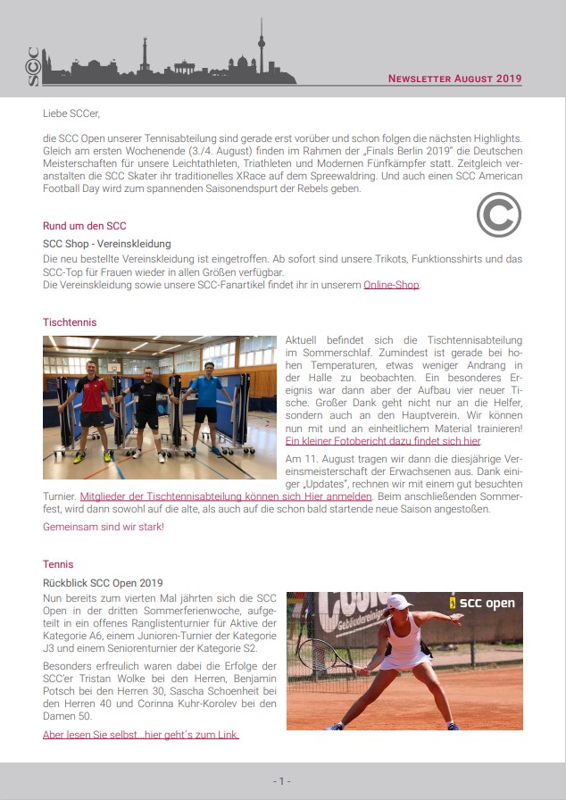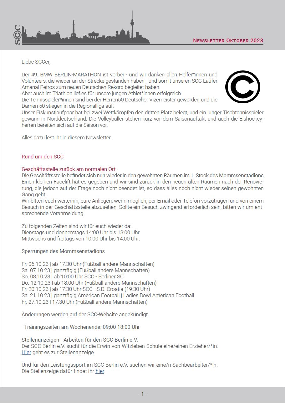 Hier ist er nun - Der erste SCC-Newsletter! Ziel ist es, einen regelmäßigen Informationsaustausch zwischen der Geschäftsstelle, allen Abteilungen sowie den Mitgliedern zu schaffen und dadurch das Gemeinschaftsbewusstsein im gesamten Verein zu stärken. Denn: Nur Gemeinsam sind wir stark. Deshalb haben wir eine bunte Mischung an Informationen aus allen Abteilungen, die für Oktober etwas zu verkünden haben, zusammengestellt und wünschen viel Spaß beim Lesen.