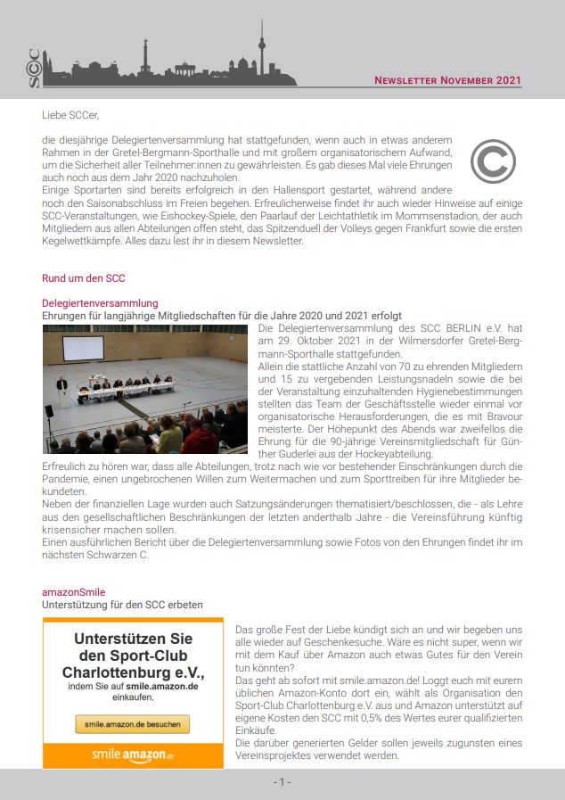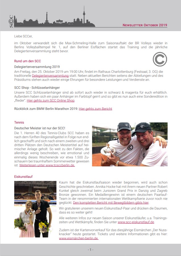 Von personellen Veränderungen in der Geschäftsstelle über den neuen SCC Online Shop bis hin zu bereits geglückten Saisonstarts sowie anstehenden Pokalkrachern in den einzelnen Abteilungen hält der Oktober-Newsletter jede Menge Neuigkeiten bereit. Auch unsere alljähriliche Delegiertenversammlung findet Ende des Monats statt. Wir wünschen viel Spaß beim Lesen.
