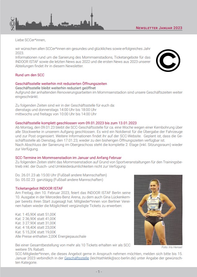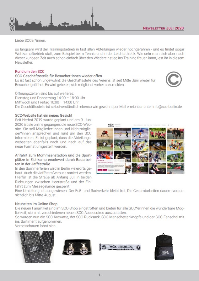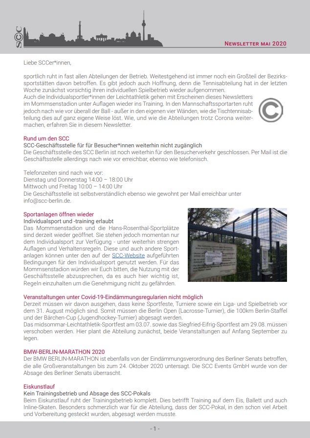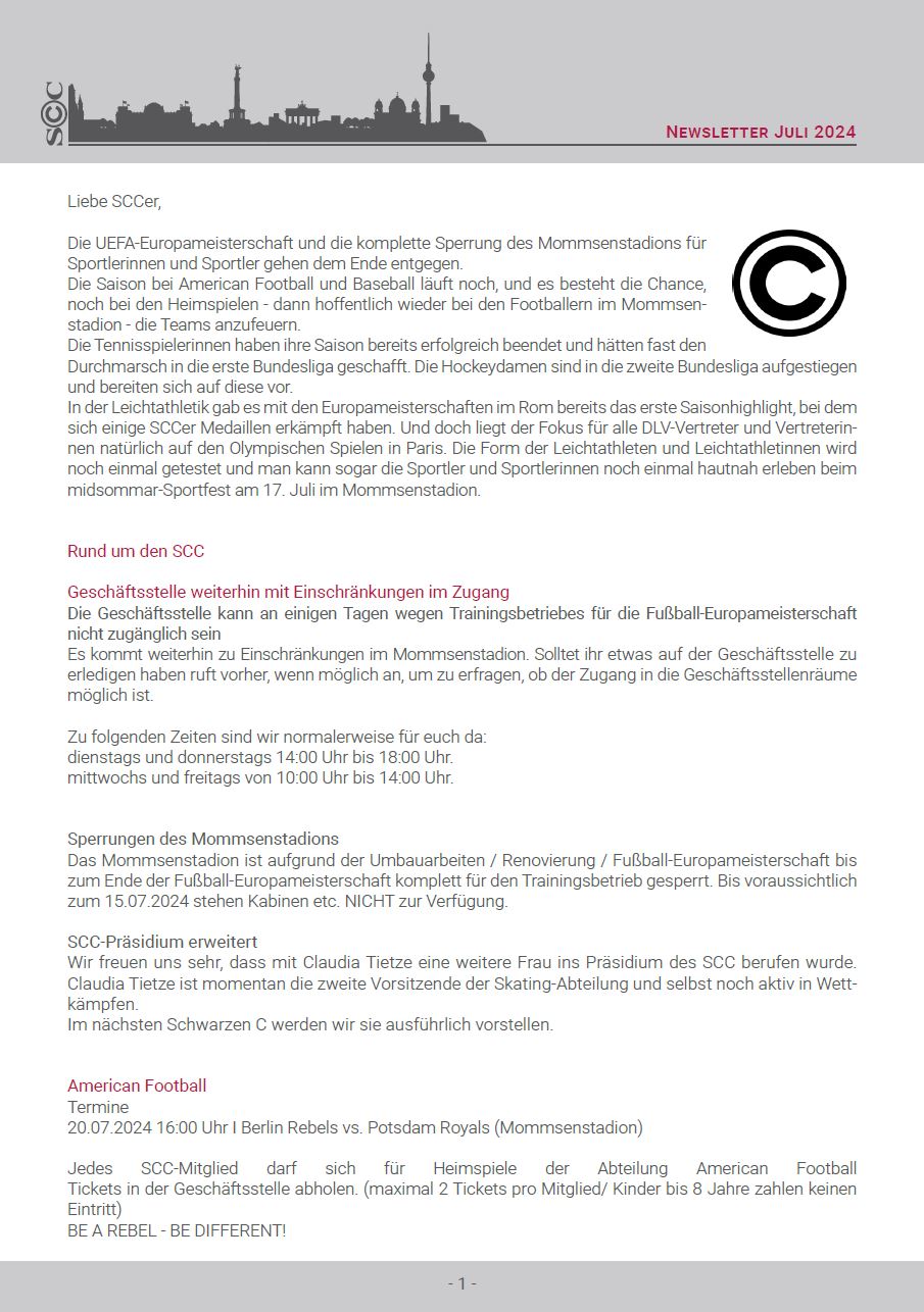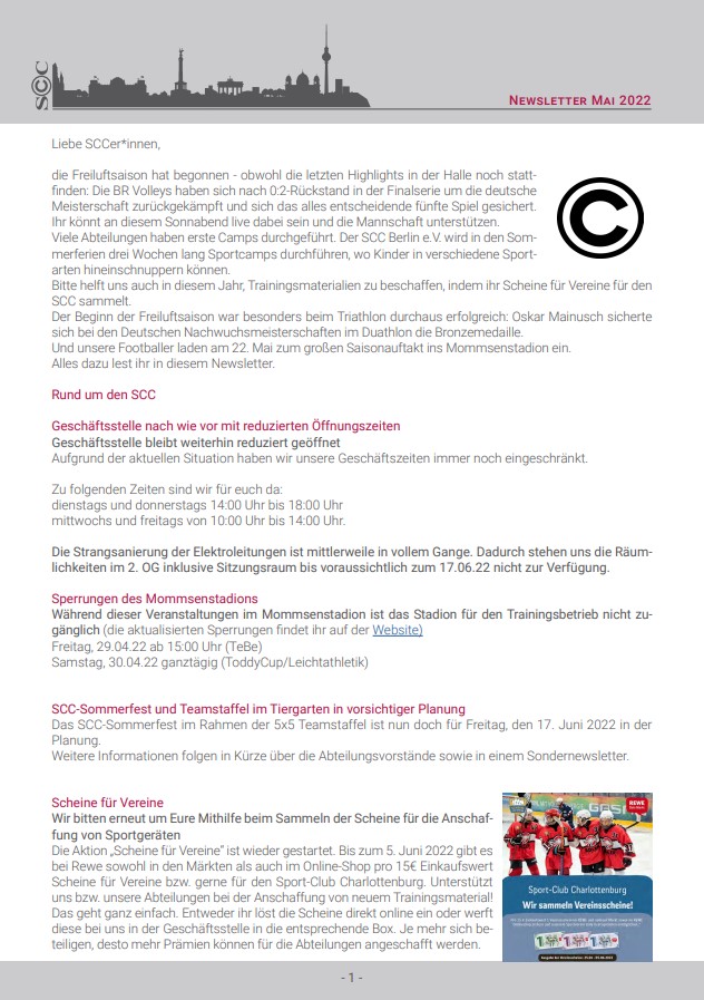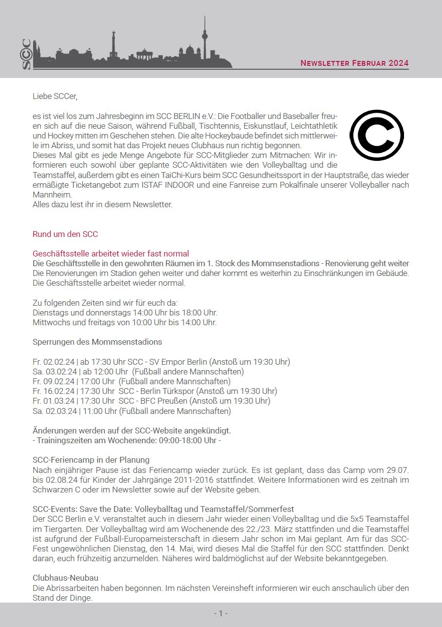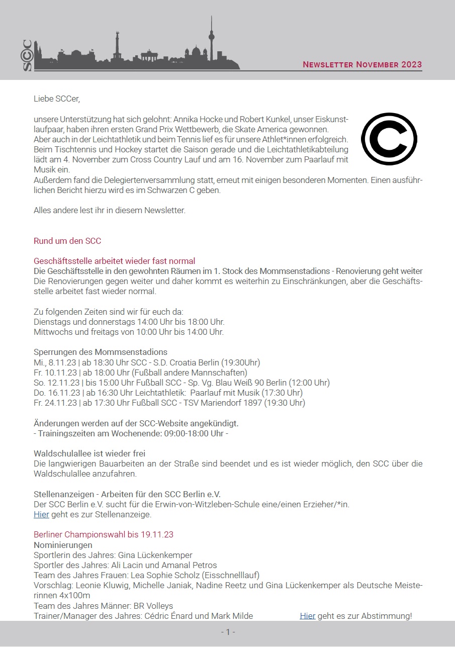 Viele andere Informationen rund um die Sanierung des Mommsenstadions sowie die Wahl der Champions, bei der dieses Mal wieder einige SCCer im Rennen sind, findet ihr in diesem Newsletter.