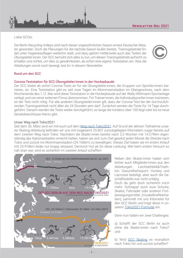 Es tut sich etwas. Kinder unter 12 Jahren sind momentan mit Übungsleiter:innen in Kleingruppen auf den Sportplätzen im Einsatz. Vorsichtig öffnet die Tennisabteilung ebenfalls wieder Plätze. Die Berlin Recycling Volleys durften im Rahmen eines Pilotprojektes vor Zuschauer:innen spielen und haben es sehr genossen. Einige Leichtathlet:innen waren bei der Deutschen Meisterschaft und Annika Hocke und Robert Kunkel traten in Stockholm bei der Eiskunstlauf-