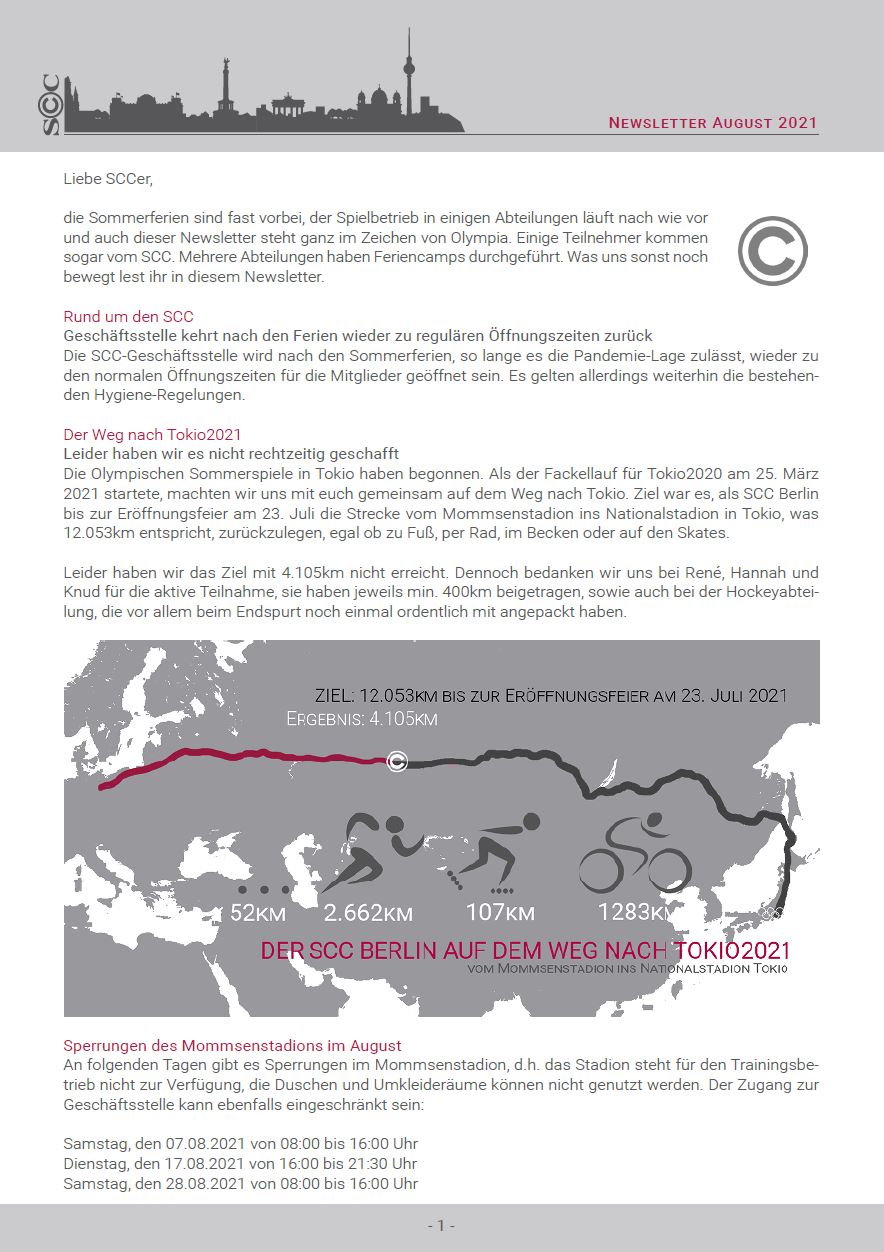 Die Sommerferien sind fast vorbei und es folgen weitere Abteilungen in den richtigen Trainingsbetrieb sowie in den Wettkampfbetrieb, zum Beispiel Baseball. Die Leichtathleten haben endlich wieder im heimischen Mommsenstadion einen Wettkampf austragen können. Der SCC BERLIN begrüßt zudem demnächst eine neue Abteilung und wird in verschiedenen neuen Bereichen aktiv. Alles dazu lest ihr in diesem Newsletter.