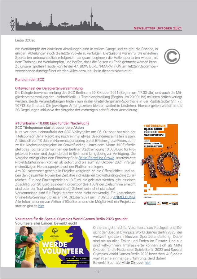 Der Oktober steckt wieder voller SCC-Ereignisse. Neben der alljährlichen Delegiertenversammlung finden u.a. die Deutsche Meisterschaft im Sitzvolleyball, der Saison-Heimauftakt unserer Volleyballer sowie ein neuer Kurs der Gesundheitssportabteilung statt. Auch spannende Rückblicke, wie z.B. auf den 10. Meisterschaftsgewinn unserer Softballerinnnen, finden sich auf den folgenden Seiten wieder.