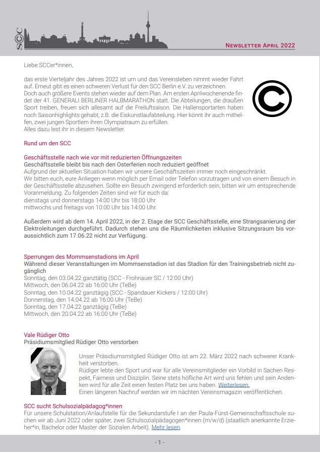 Das erste Vierteljahr des Jahres 2022 ist um und das Vereinsleben nimmt wieder Fahrt auf. Erneut gibt es einen schweren Verlust für den SCC Berlin e.V. zu verzeichnen.