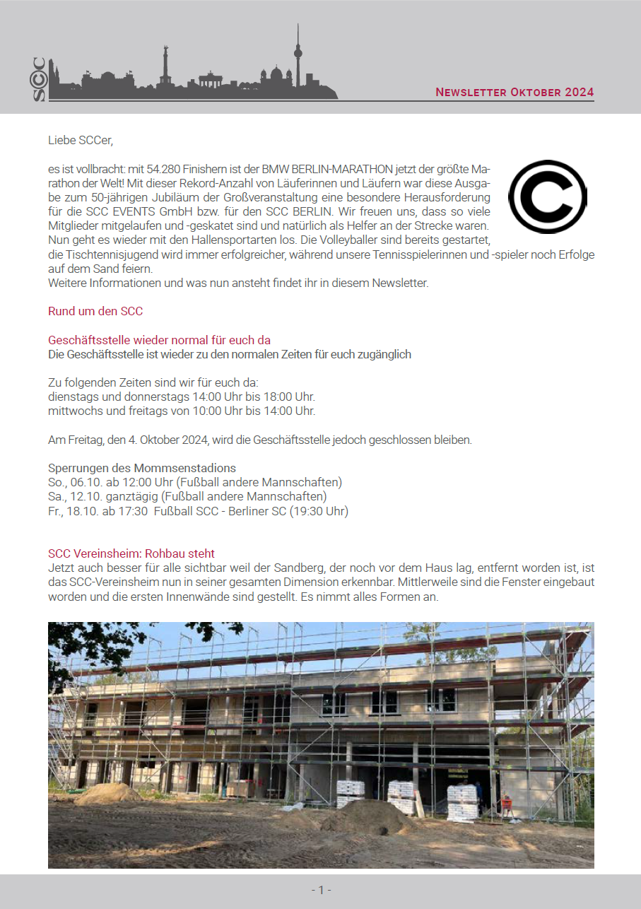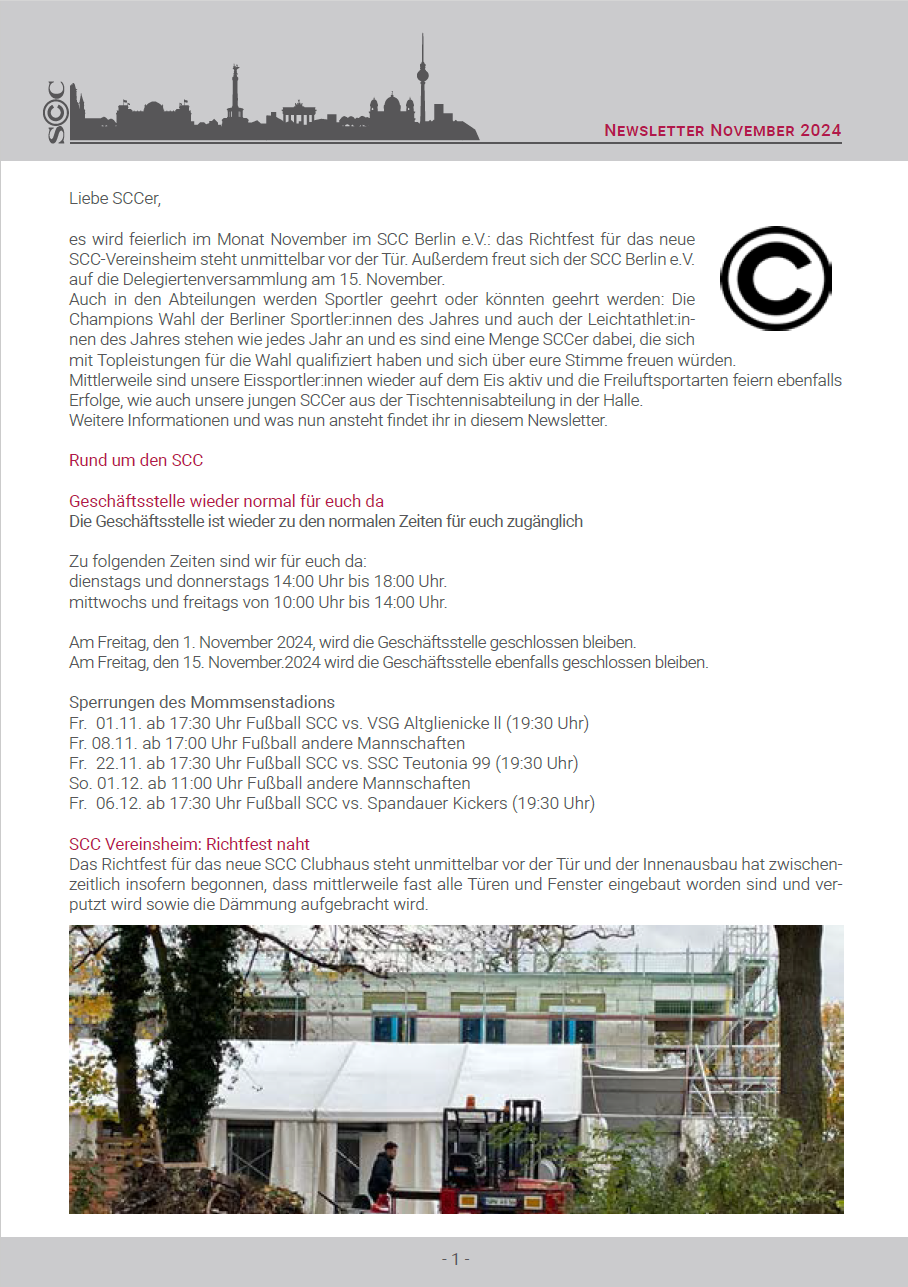 Es wird feierlich im Monat November im SCC Berlin e.V.: das Richtfest für das neue SCC-Vereinsheim steht unmittelbar vor der Tür. Außerdem freut sich der SCC Berlin e.V. auf die Delegiertenversammlung am 15. November.