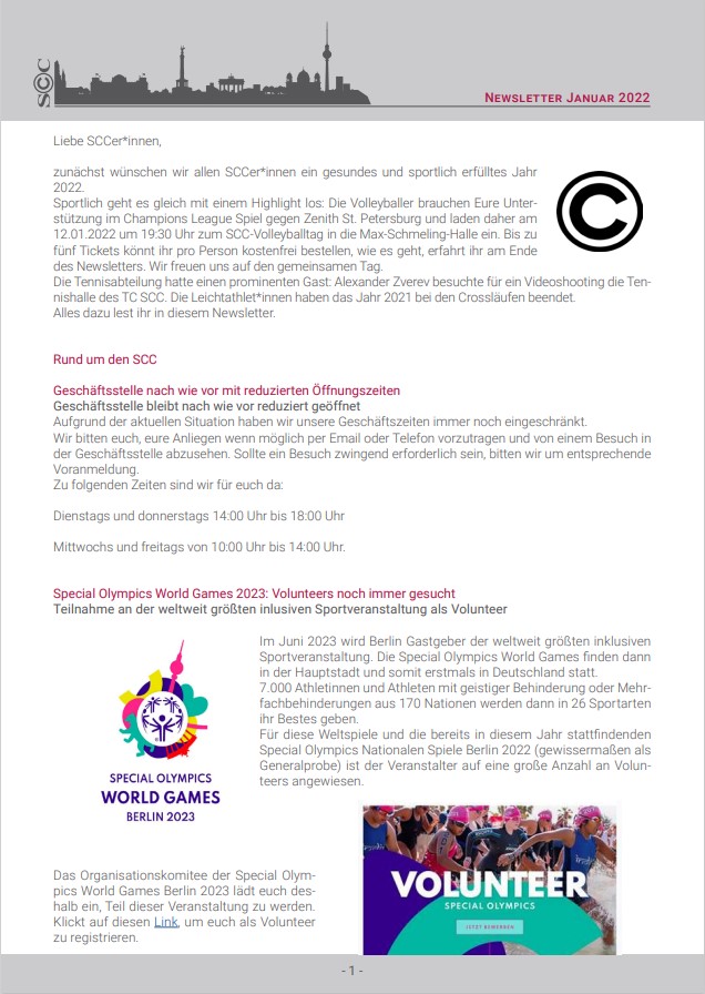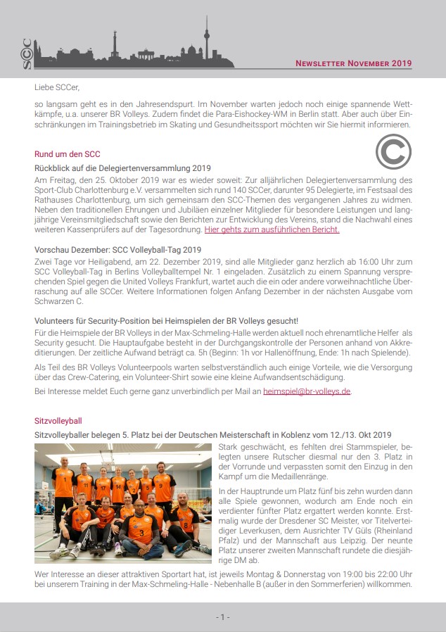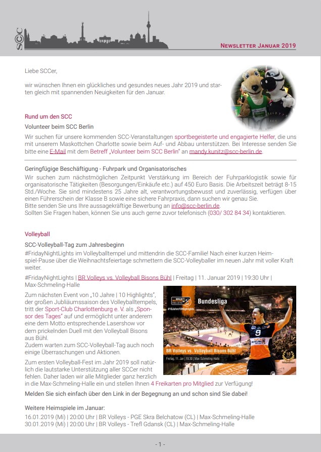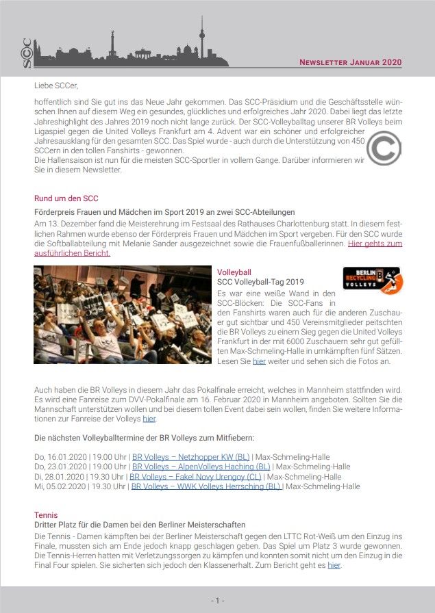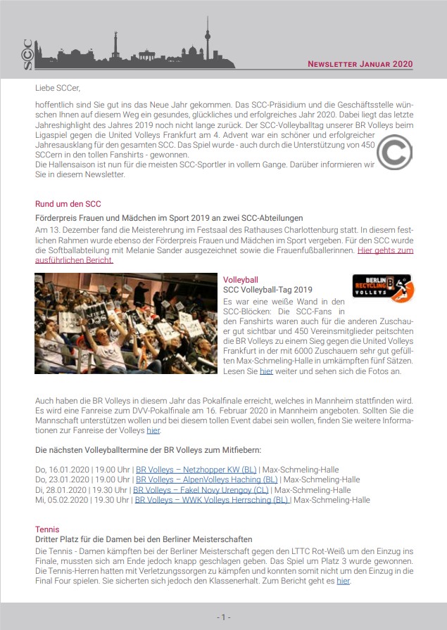 Hoffentlich sind Sie gut ins das Neue Jahr gekommen. Das SCC-Präsidium und die Geschäftsstelle wünschen Ihnen auf diesem Weg ein gesundes, glückliches und erfolgreiches Jahr 2020. Dabei liegt das letzte Jahreshighlight des Jahres 2019 noch nicht lange zurück. Der SCC-Volleyballtag unserer BR Volleys beim Ligaspiel gegen die United Volleys Frankfurt am 4. Advent war ein schöner und erfolgreicher Jahresausklang für den gesamten SCC. Das Spiel wurde - auch durch die Unterstützung von 450 SCCern in den tollen Fanshirts - gewonnen. Die Hallensaison ist nun für die meisten SCC-Sportler in vollem Gange. Darüber informieren wir Sie in diesem Newsletter.