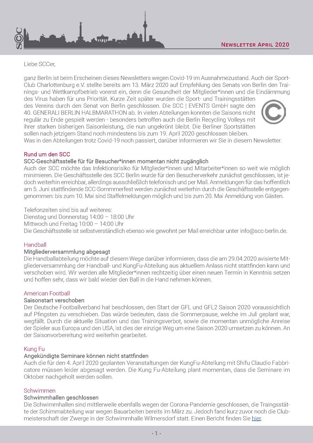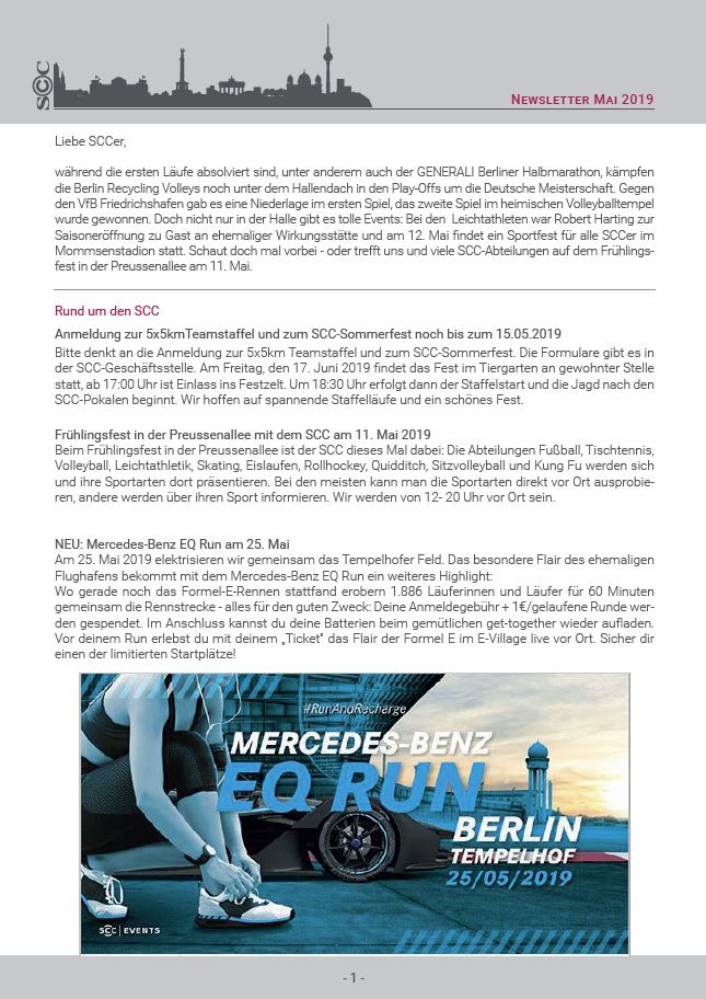 April, April...? Nein, kein Scherz! Der neue Newsletter ist da. Für einige Abteilungen ist die Saison nun wieder beendet, andere treibt es bei sommerlichen Temperaturen wieder raus aufs Feld. Unsere Schwimmer suchen dringend Trainer. Während die BR Volleys sich im Endspurt um den Meistertitel befinden und alle SCC-Mitglieder wieder ganz herzlich zu den Heimspielen einladen. Und auch unsere Rebels laden zum Derby-Saisonauftakt!