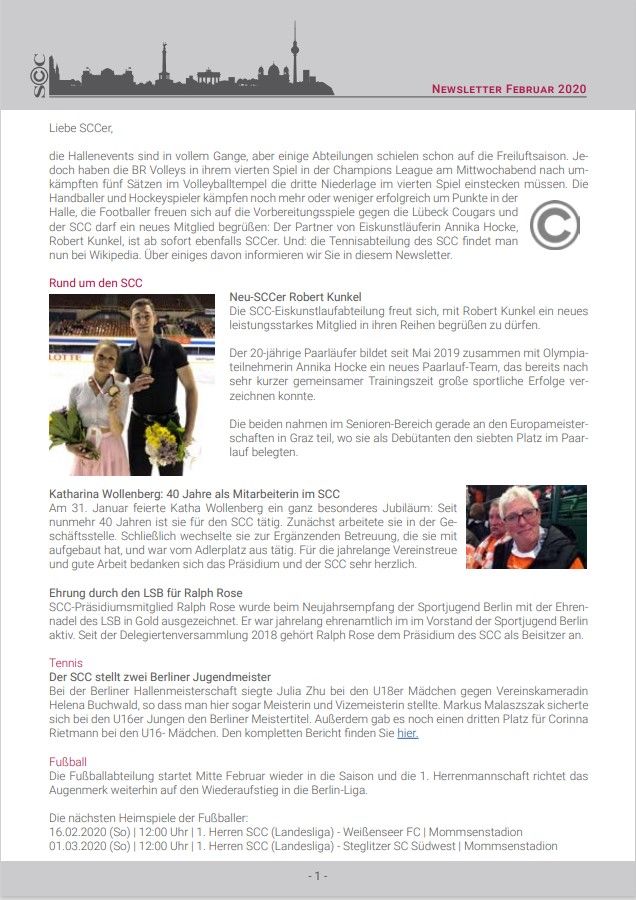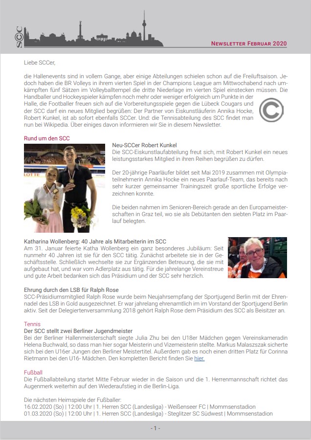 Die Hallenevents sind in vollem Gange, aber einige Abteilungen schielen schon auf die Freiluftsaison. Jedoch haben die BR Volleys in ihrem vierten Spiel in der Champions League am Mittwochabend nach umkämpften fünf Sätzen im Volleyballtempel die dritte Niederlage im vierten Spiel einstecken müssen. Die Handballer und Hockeyspieler kämpfen noch mehr oder weniger erfolgreich um Punkte in der Halle, die Footballer freuen sich auf die Vorbereitungsspiele gegen die Lübeck Cougars und der SCC darf ein neues Mitglied begrüßen: Der Partner von Eiskunstläuferin Annika Hocke, Robert Kunkel, ist ab sofort ebenfalls SCCer. Und: die Tennisabteilung des SCC findet man nun bei Wikipedia. Über einiges davon informieren wir Sie in diesem Newsletter.