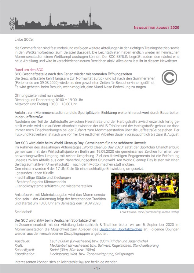 Die Sommerferien sind fast vorbei und es folgen weitere Abteilungen in den richtigen Trainingsbetrieb sowie in den Wettkampfbetrieb, zum Beispiel Baseball. Die Leichtathleten haben endlich wieder im heimischen Mommsenstadion einen Wettkampf austragen können. Der SCC BERLIN begrüßt zudem demnächst eine neue Abteilung und wird in verschiedenen neuen Bereichen aktiv. Alles dazu lest ihr in diesem Newsletter.