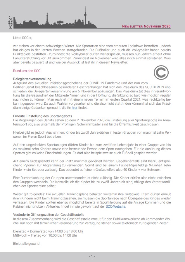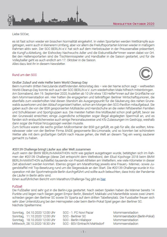 Von personellen Veränderungen in der Geschäftsstelle über den neuen SCC Online Shop bis hin zu bereits geglückten Saisonstarts sowie anstehenden Pokalkrachern in den einzelnen Abteilungen hält der Oktober-Newsletter jede Menge Neuigkeiten bereit. Auch unsere alljähriliche Delegiertenversammlung findet Ende des Monats statt. Wir wünschen viel Spaß beim Lesen.