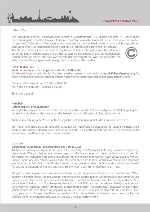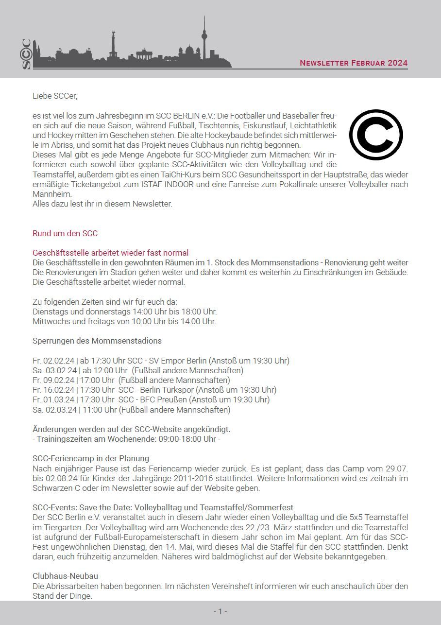 Hier sind die aktuellen Termine und Geschehnisse rund um den SCC. Für die Leichtathleten stehen im Februar zahlreiche Meisterschaften auf dem Programm. Die Fußballabteilung sucht neue Jugendspieler, im Baseball gab es einen Vorstandswechsel und die BR Volleys laden Sie alle herzlich zu den nächsten Heimspielen ein. Das und vieles mehr lesen Sie auf den nächsten Seiten.