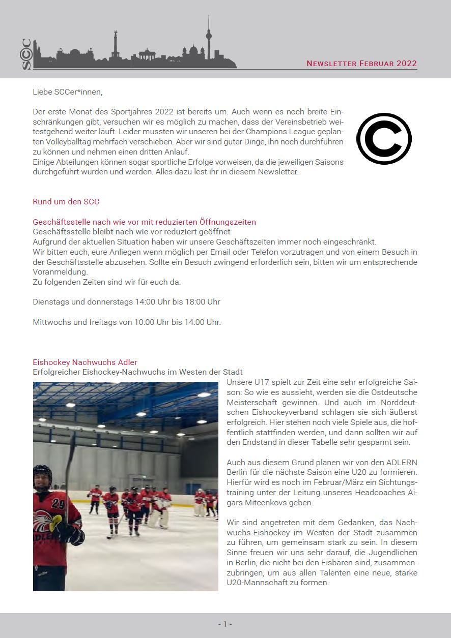 Einige Sportarten sind bereits erfolgreich in den Hallensport gestartet, während andere noch den Saisonabschluss im Freien begehen. Erfreulicherweise findet ihr auch wieder Hinweise auf einige SCC-Veranstaltungen, wie Eishockey-Spiele, den Paarlauf der Leichtathletik im Mommsenstadion, der auch Mitgliedern aus allen Abteilungen offen steht, das Spitzenduell der Volleys gegen Frankfurt sowie die ersten Kegelwettkämpfe. Alles dazu lest ihr in diesem Newsletter.
