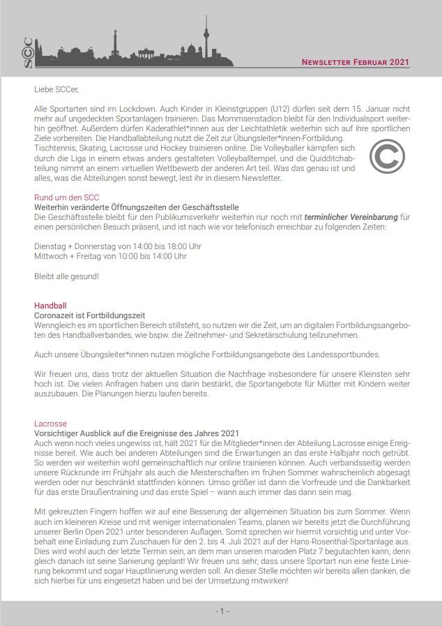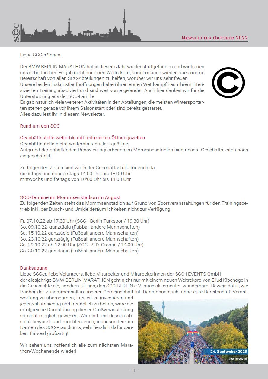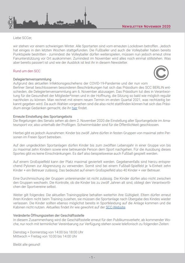 Hier ist er nun - Der erste SCC-Newsletter! Ziel ist es, einen regelmäßigen Informationsaustausch zwischen der Geschäftsstelle, allen Abteilungen sowie den Mitgliedern zu schaffen und dadurch das Gemeinschaftsbewusstsein im gesamten Verein zu stärken. Denn: Nur Gemeinsam sind wir stark. Deshalb haben wir eine bunte Mischung an Informationen aus allen Abteilungen, die für Oktober etwas zu verkünden haben, zusammengestellt und wünschen viel Spaß beim Lesen.
