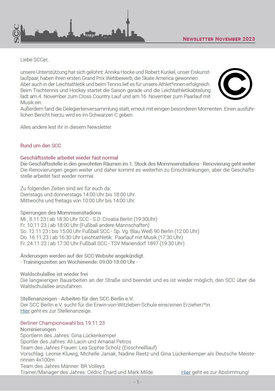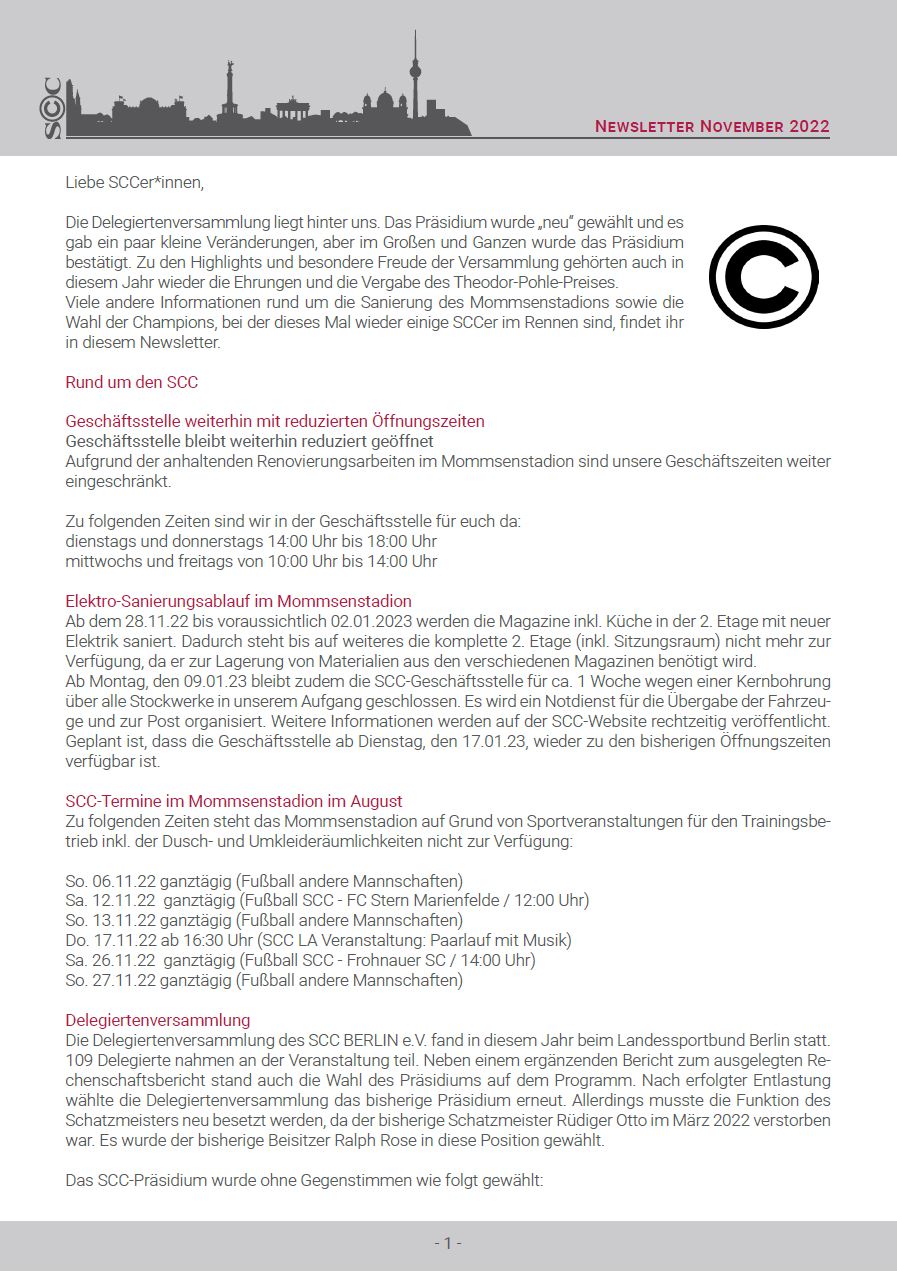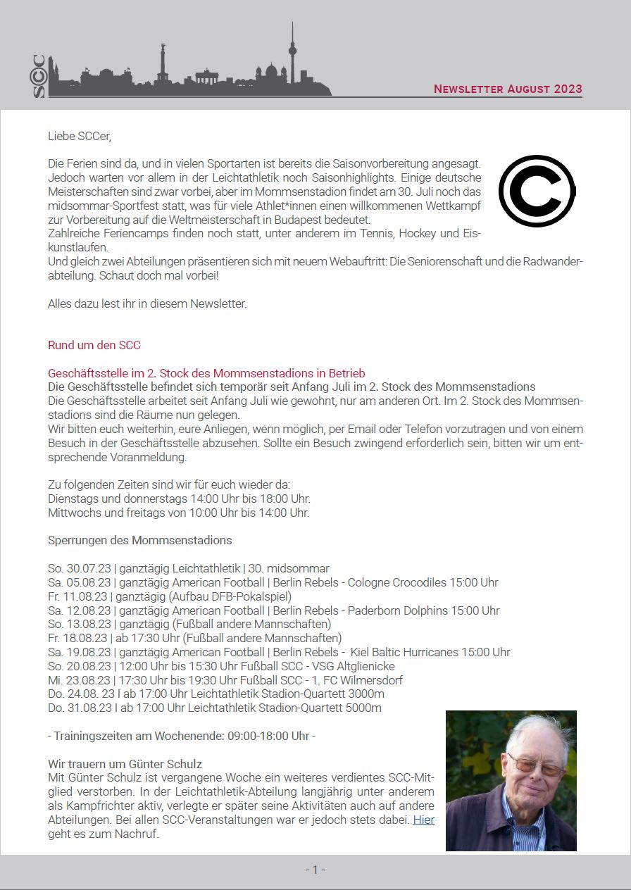 Viele andere Informationen rund um die Sanierung des Mommsenstadions sowie die Wahl der Champions, bei der dieses Mal wieder einige SCCer im Rennen sind, findet ihr in diesem Newsletter.