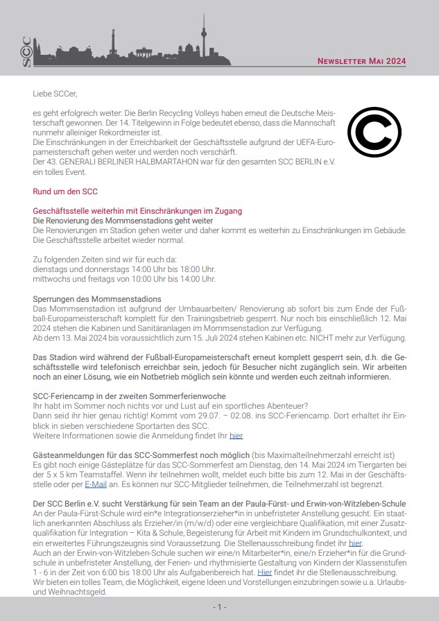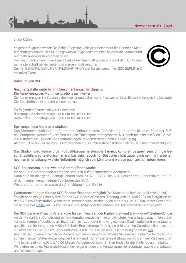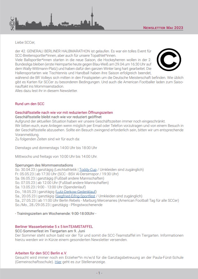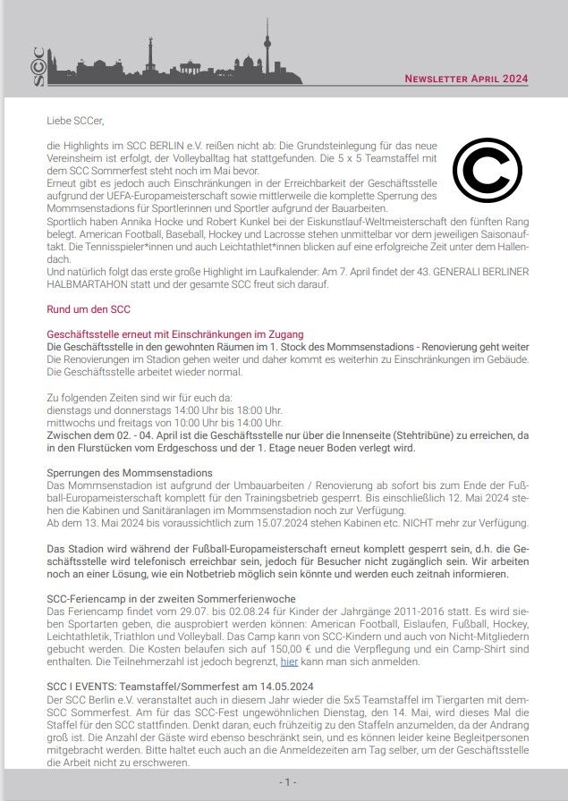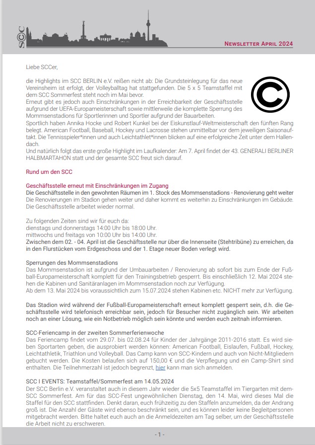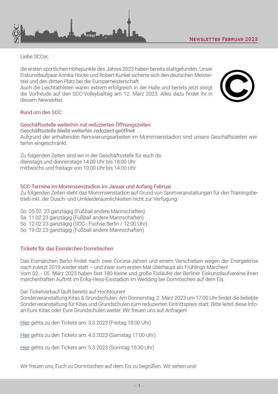 Viele andere Informationen rund um die Sanierung des Mommsenstadions sowie die Wahl der Champions, bei der dieses Mal wieder einige SCCer im Rennen sind, findet ihr in diesem Newsletter.