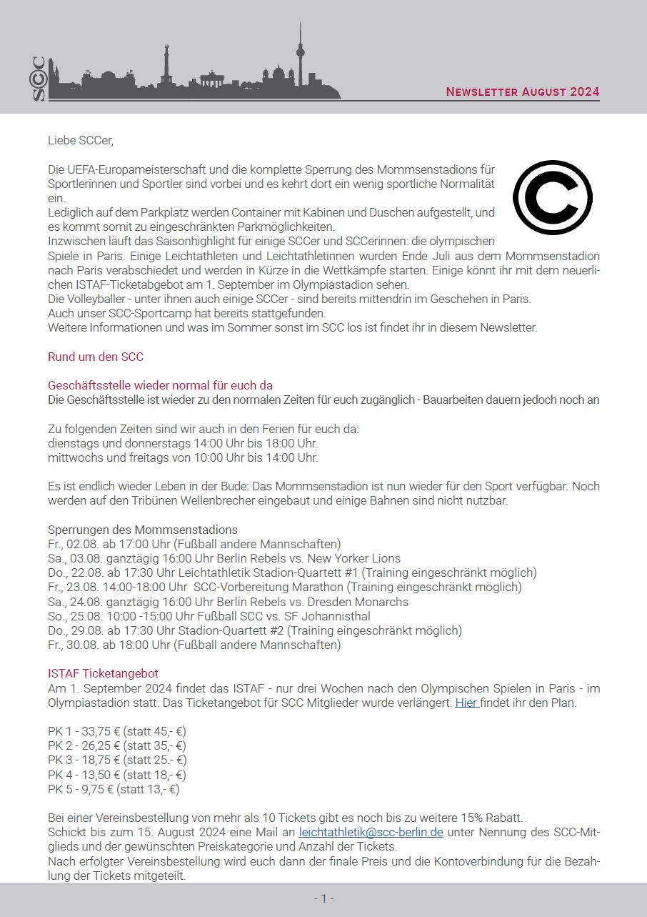 Inzwischen läuft das Saisonhighlight für einige SCCer und SCCerinnen: die olympischen Spiele in Paris. Einige Leichtathleten und Leichtathletinnen wurden Ende Juli aus dem Mommsenstadion nach Paris verabschiedet und werden in Kürze in die Wettkämpfe starten. Einige könnt ihr mit dem neuerlichen ISTAF-Ticketabgebot am 1. September im Olympiastadion sehen.